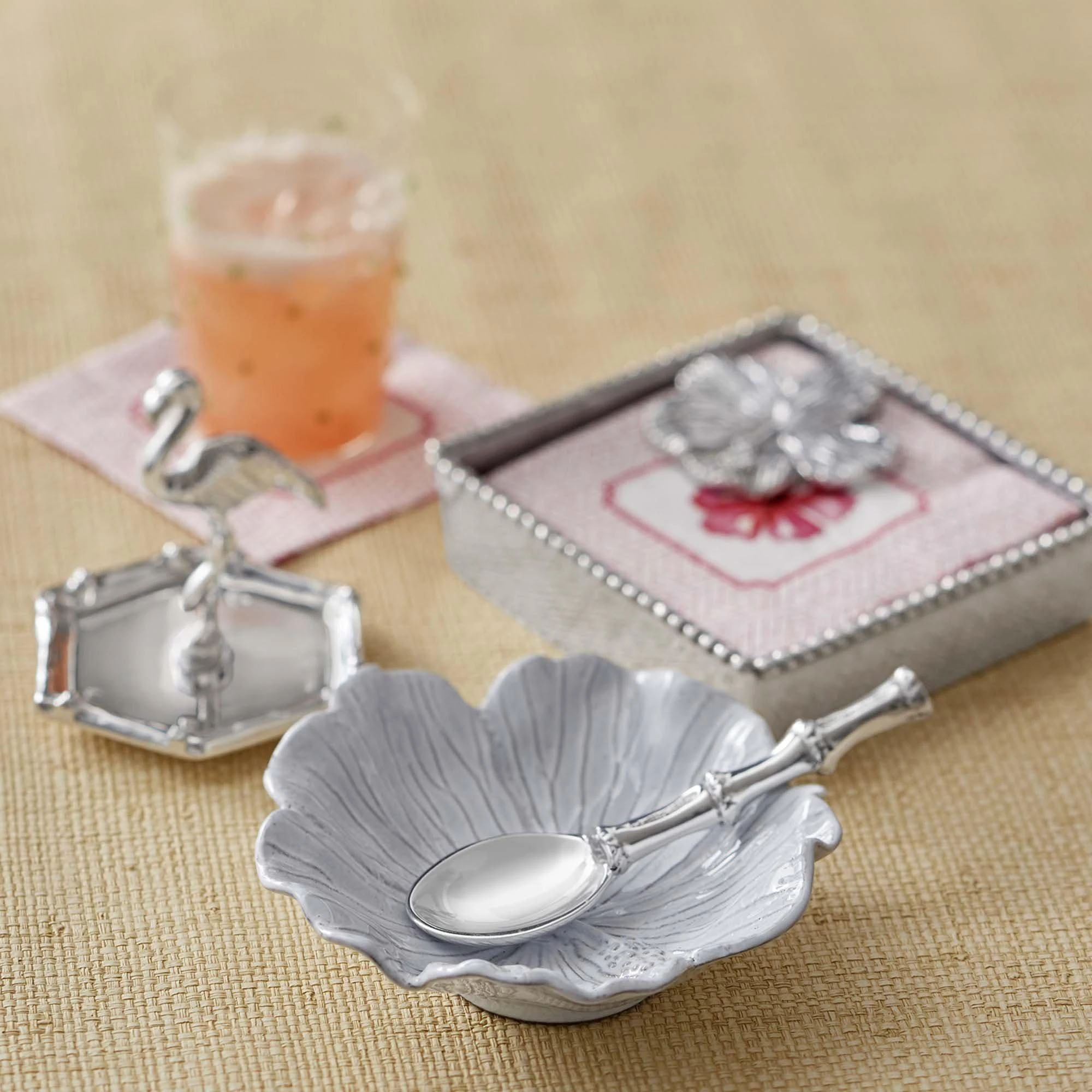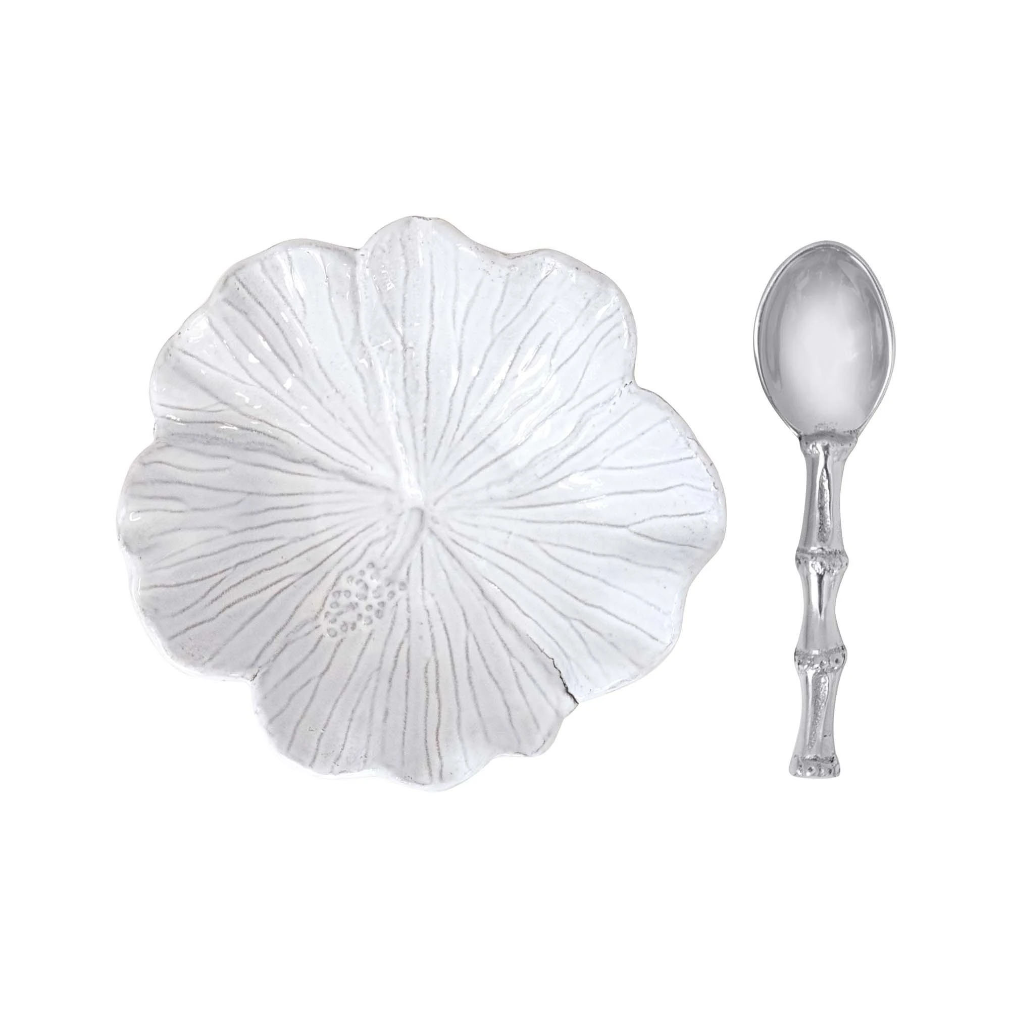 Welcome guests with this beauitful Hisbiscus Ceramic Bowl with Bamboo Spoon. Part of the our Palmy Nights collection, this handcrafted hibiscus platter and silver bamboo spoon makes a gracious serving dish for appetizers, dips or spreads. Bamboo Spoon is handcrafted from 100% recycled aluminum.